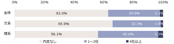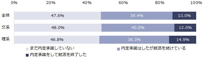 現在の内定数を伺うと、文系は34.1%(1~3社:32.5%、4社以上:1.6%)、理系は43.9%(1~3社:40.6%、4社以上:3.3% )が内定を得ていることが分かりました。すでに内定を得ている方に承諾状況を伺うと、39.4%が「内定承諾はしたが就活を続けている」と回答しました。