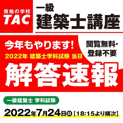 資格の学校TACでは、7/22(金)に発表予定の「令和四年 一級建築士設計製図試験の課題」に基づき、TACの見解を当日の14:00頃、TACホームページで公開いたします。
