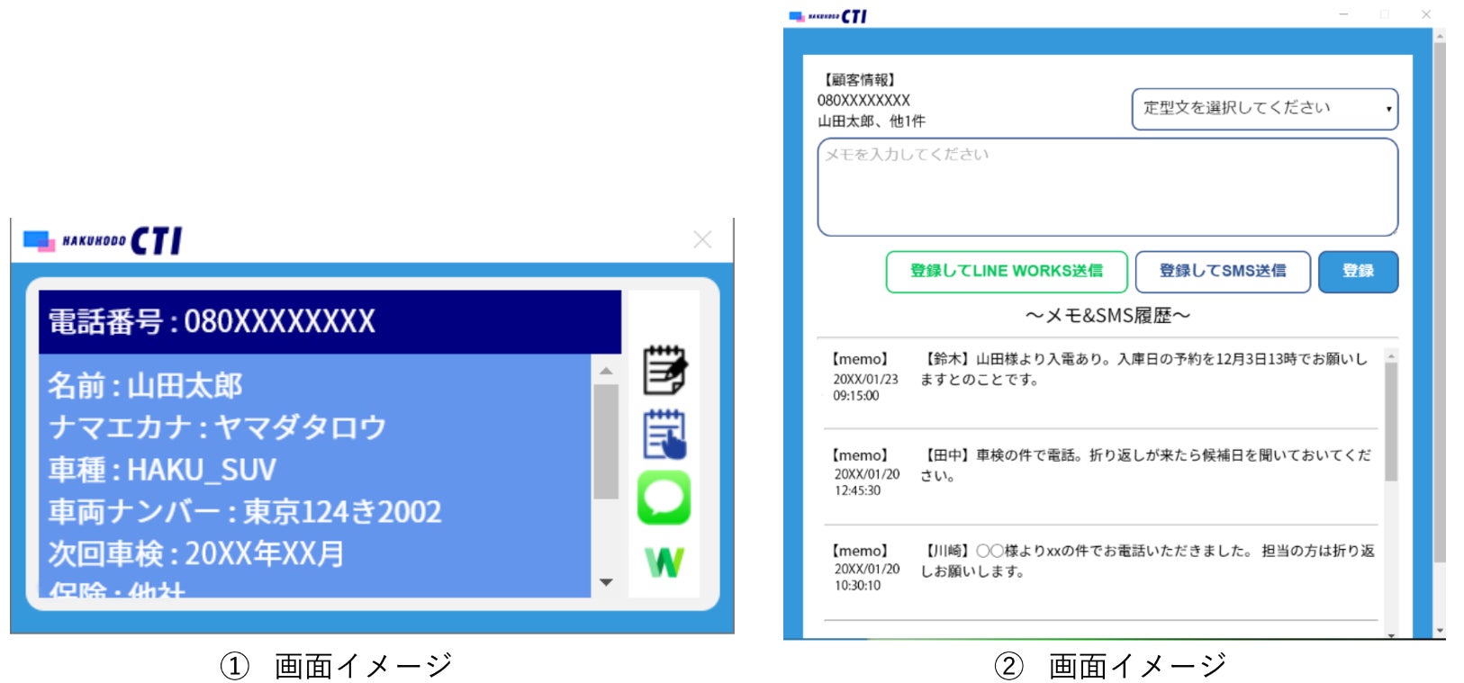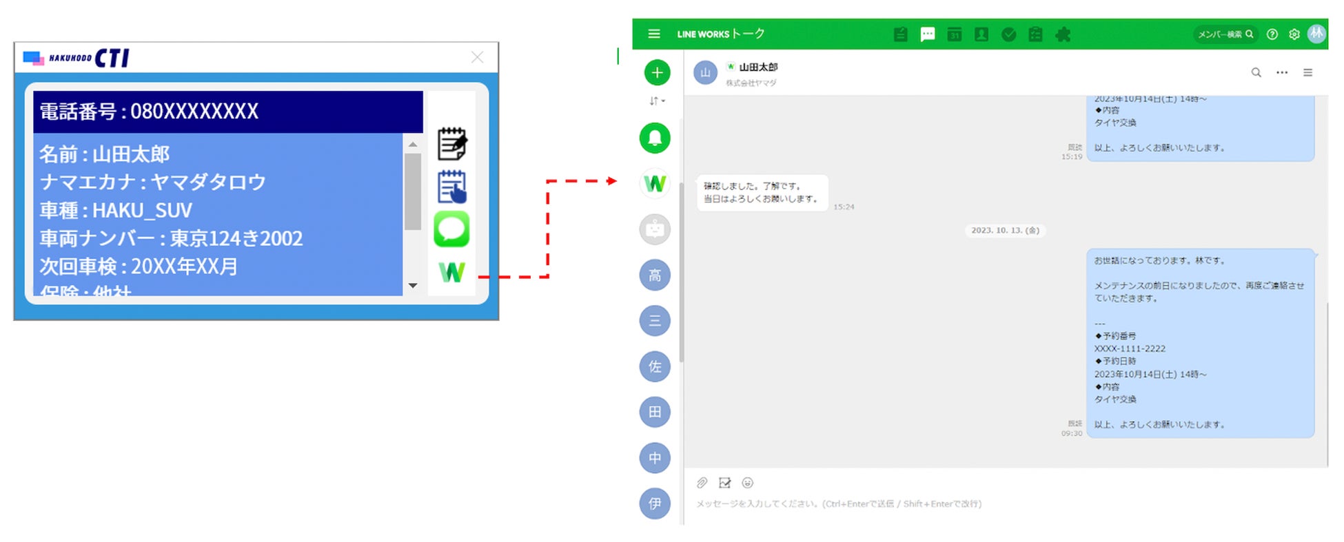 HAKUHODO CTIとLINE WORKSを連携することにより、顧客と営業スタッフのLINE WORKSでのやりとりを、①のポップアップ上で確認することができます。電話着信時に過去の商品・サービス購入や、定期対応の時期等の状況とこれまでのやり取りを把握できることで、顧客サービスのさらなる向上に繋がります。また②のメモの共有もLINE WORKS上で行うことができ、社内での共有が簡易になります。