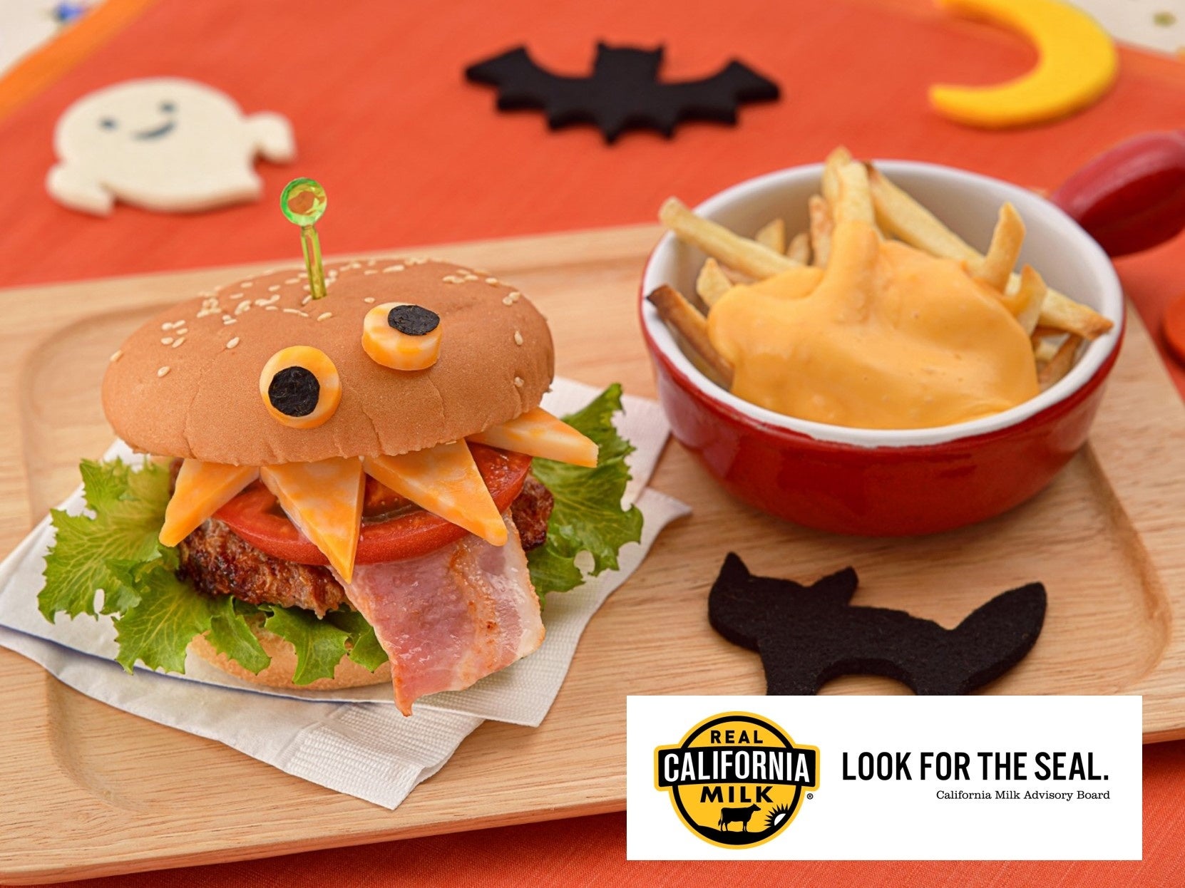 おいしいチーズを使って、ハロウィンにぴったりなモンスターチーズバーガーを作りましょう。チーズソースをたっぷりとかけたフライドポテトと一緒にお楽しみください。
