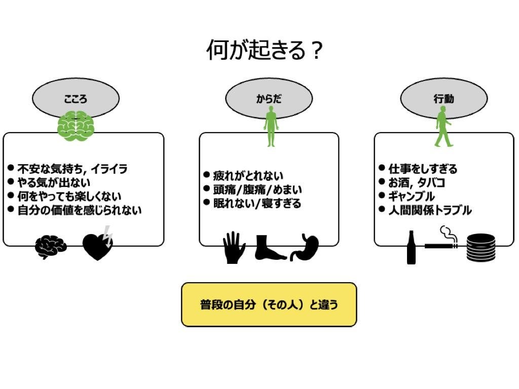 メンタルヘルス不調の症状を、小塩先生は「こころ」「からだ」「行動」に分けて説明しました。「こころ」の症状としては、不安な気持ちやイライラ、やる気がでない、何をしても楽しくない、自分の価値を感じられない、などが挙げられます。同様に「からだ」の症状は、疲れが取れない、頭痛・腹痛・めまいがある、眠れない・寝すぎる、など。「行動」に現れる症状には仕事をしすぎる、お酒やタバコ、ギャンブル、人間関係トラブルなどがあります。いずれも、「普段の自分(や友だち)とは違う」ことがメンタルヘルス不調のサインとなります。つまり「普段の自分や友だち」を知っておくことが、メンタルヘルス不調に早期に気付くポイントになります。