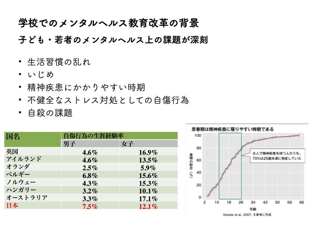 その背景には、子どもや若者のメンタルヘルス上の課題の深刻化があります。生活習慣の乱れやいじめなどに加え、思春期はそもそも精神疾患にかかりやすい時期です。そんな中、早いタイミングでメンタルヘルスに関する知識を教えていくことで、若者がこの課題について知ることは、大きな意義があるでしょう。また学校教育に組み込まれることで、社会的な関心が高まる効果もある、と小塩先生は説明しました。