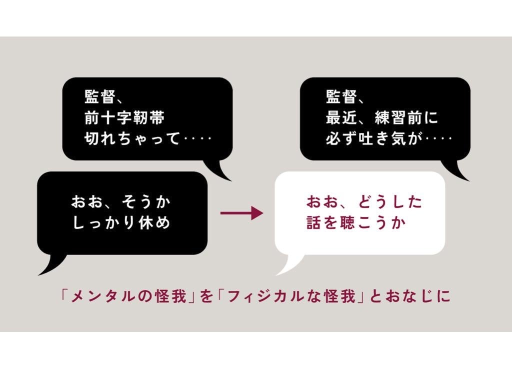 例えばアスリートが身体的なケガをした場合、監督は「しっかり休め」というでしょう。ところが、例えば「練習前に必ず吐き気がします」といった精神的な不調に関しては、「いいから早く走ってこい」と軽視しがちです。しかしメンタルの不調は身体的なケガと同様、根性で解決するものではありません。ですから「メンタルのケガ」も「フィジカルなケガ」と同じように扱うべきだ、と小塩先生は訴えます。