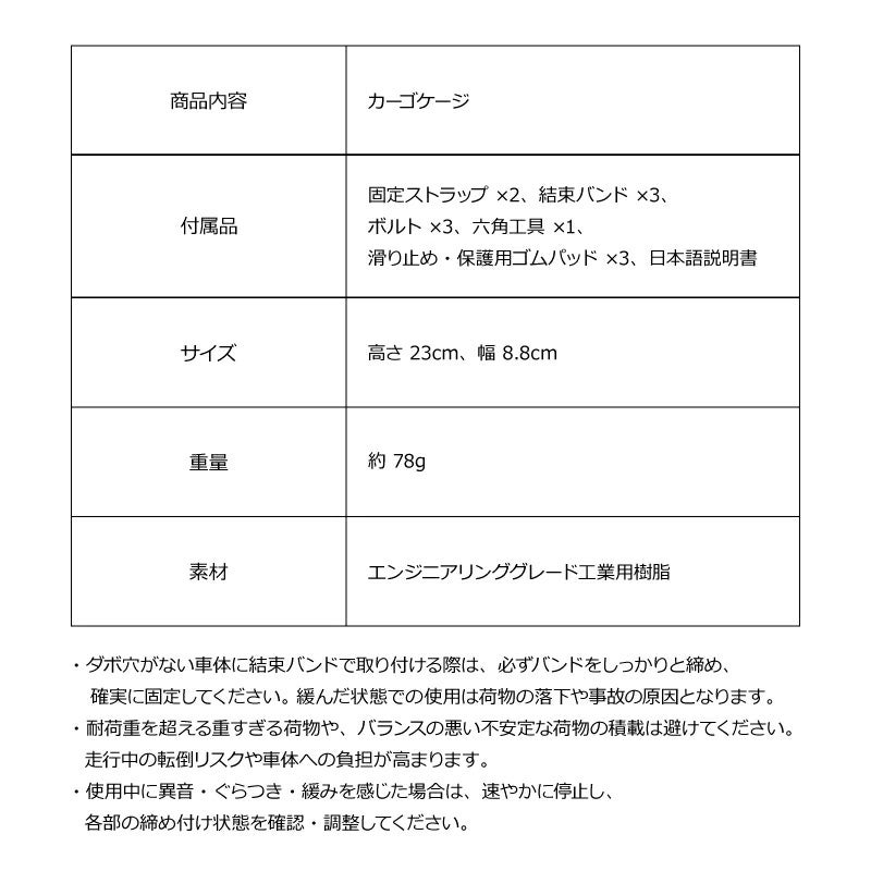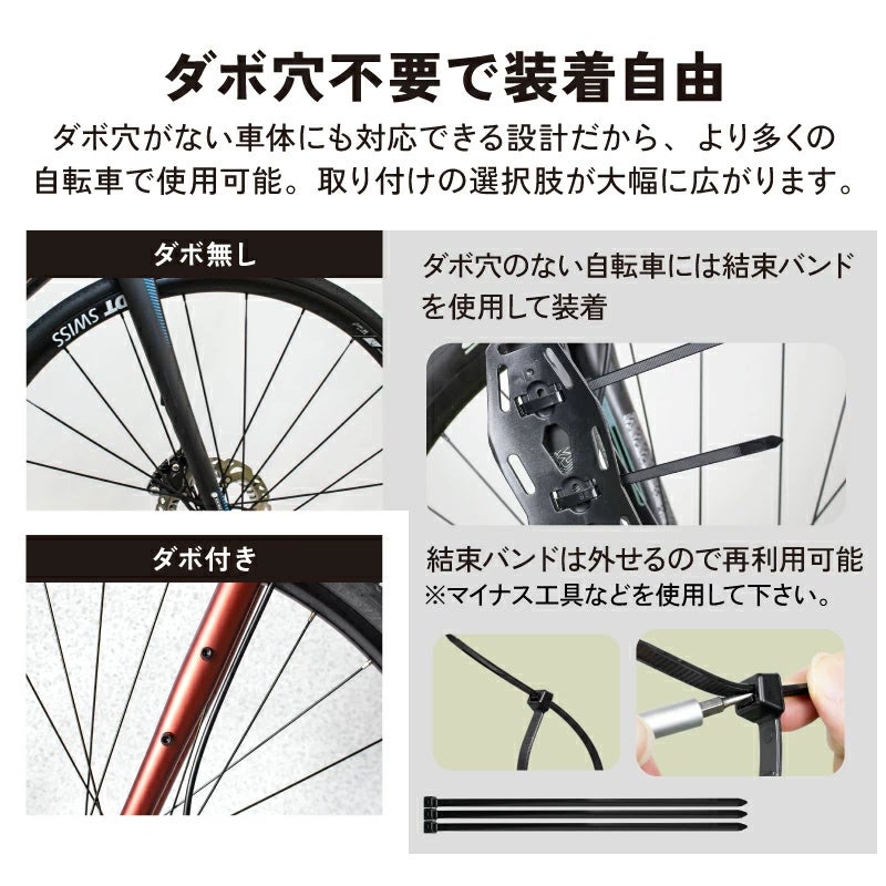 ・ダボ穴がない車体に結束バンドで取り付ける際は、必ずバンドをしっかりと締め、確実に固定してください。 緩んだ状態での使用は荷物の落下や事故の原因となります。