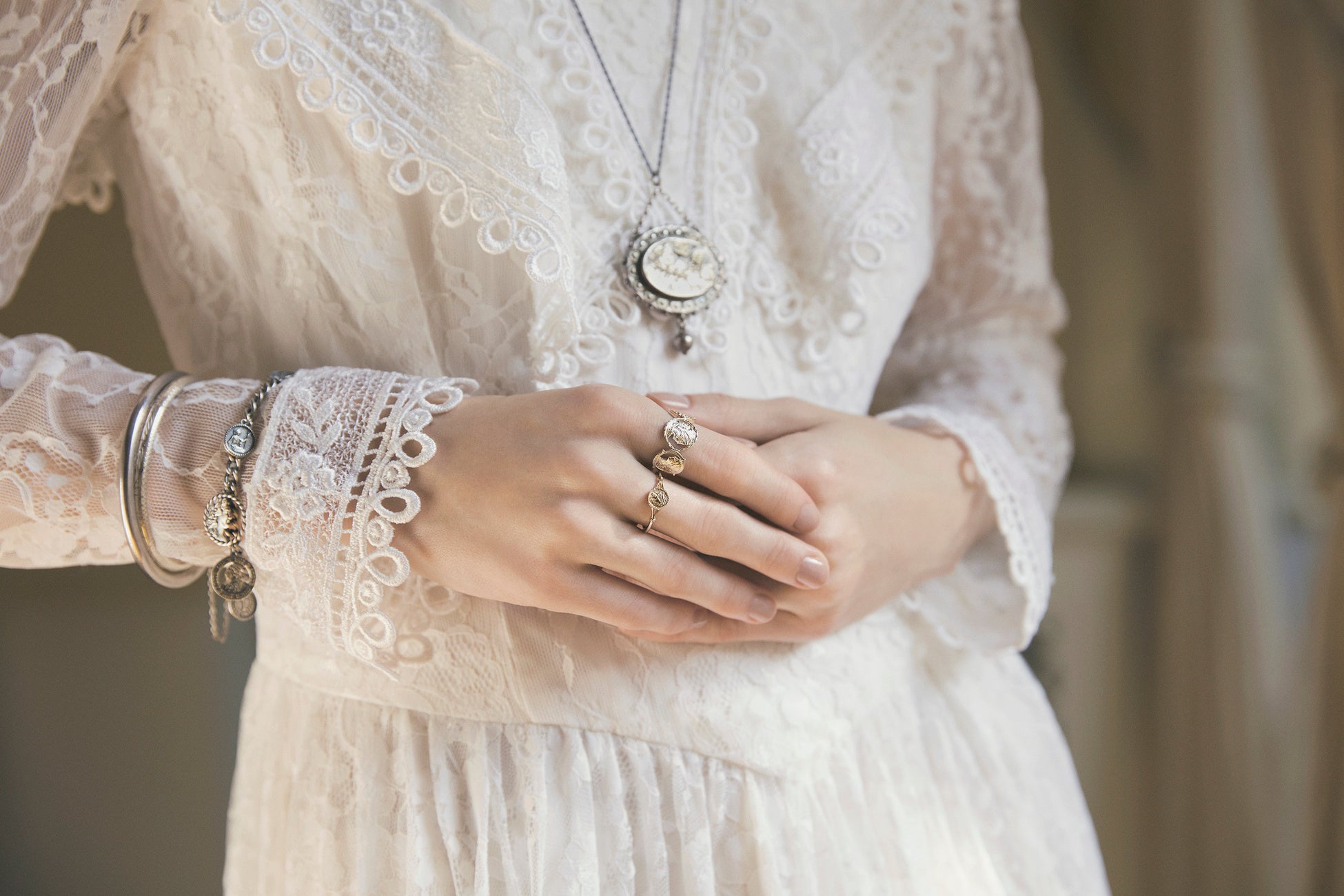 “Dears”の頭文字になぞらえた5つの石が煌めき、古代ローマの神話に登場する女神「ウィクトーリア」をモチーフに透かしを施したオリジナルコインのネックレスと、繋いだ手のモチーフが絆を意味するアイオライトのリバーシブルリング。どちらも今だけの特別なコレクションです。