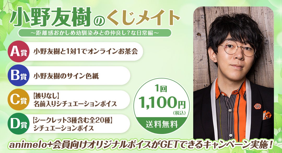 本くじメイトにおける景品は、A賞が小野友樹さんと1対1で直接お話ができるオンラインお茶会の参加権。B賞は小野友樹さんのサイン入り色紙。C賞は "あなた" のお名前が入ったあなたに向けてのシチュエーションボイス。D賞は小野友樹さん演じる幼馴染とのシチュエーションボイス(全20種類。シークレットのボイス3種を含む)となります。