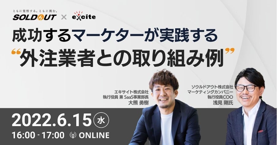 エキサイト株式会社(所在地:東京都港区、代表取締役社長:西條 晋一、以下「エキサイト」)は、2022年6月15日(水)16:00〜 に、ソウルドアウト株式会社・執行役員COOの浅見 剛氏を迎え、成功するマーケター が実践する“外注業者との取り組み例”をテーマに、参加費無料のウェビナーを開催することをお知らせします。