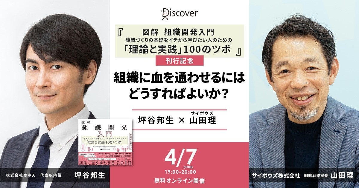株式会社ディスカヴァー・トゥエンティワン(本社:東京都千代田区、取締役社長:谷口奈緒美)は、2022年4月7日に『図解 組織開発入門 組織づくりの基礎をイチから学びたい人のための「理論と実践」100のツボ』(坪谷邦生・著)の刊行を記念して、著者の坪谷邦生氏と、サイボウズ株式会社で組織戦略室長を務める山田理氏の対談イベントを、オンラインにて開催します。