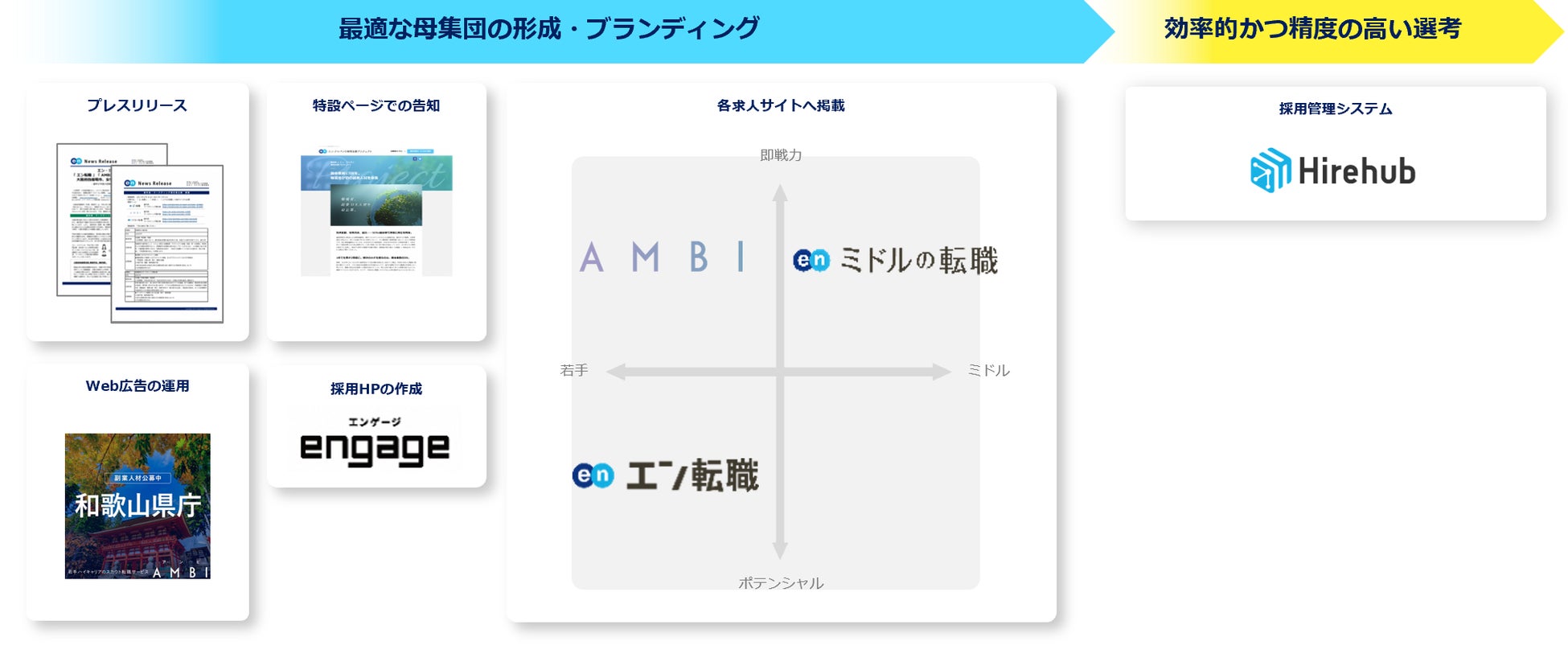 プレスリリースや特設ページ、採用HPの作成、Web広告での告知に加え、各求人サイトでの集客サポートを実施いたします。『エン転職』『AMBI』『ミドルの転職』とターゲットの異なる3つの求人サイトを活用することで、ターゲットへ網羅的に求人を届けます。さらに採用管理システム『Hirehub』の提供により、選考フローを支援。求職者と同社の適切なマッチングを実施します。
