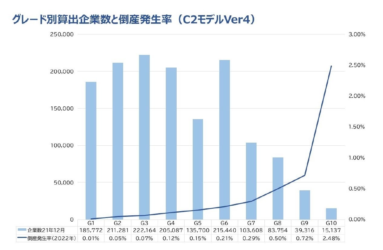 個別企業ごとに予測したリスク指標をG1~G10の10段階のグレードに設定しており、G1が最も倒産リスクが小さく、G10が最もリスクが高いグレードとなっている