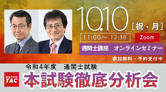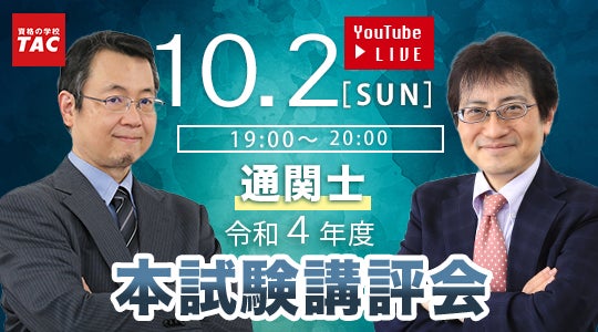 通関士、不動産鑑定士、宅建士、司法書士、日商簿記検定、公認会計士、公務員などの資格取得に向けた教育サービスを展開しているTAC株式会社(東京都千代田区、代表取締役社長:多田敏男)は、2022年10月2日(日)に実施される令和4年度(2022年度)通関士試験の「本試験講評会」を、同日19:00からYouTube Liveで開催いたします。