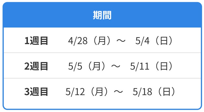 2025年 4月 28日 (月) 13:00 ~ 2025年 5月 18日 (日) 13:00