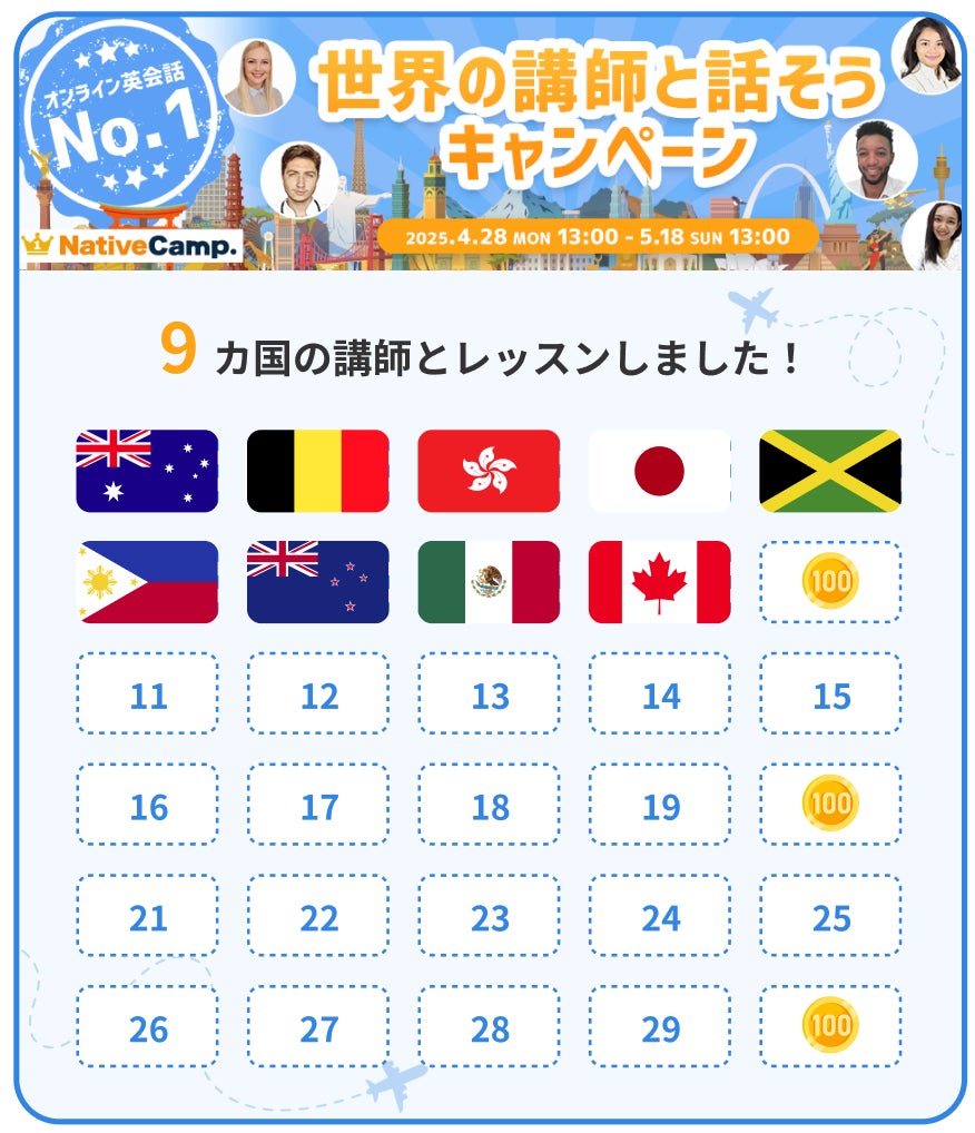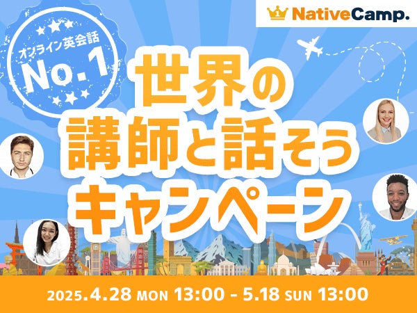 ネイティブスピーカーと回数無制限のオンライン英会話サービス「ネイティブキャンプ英会話」を展開する株式会社ネイティブキャンプ(東京都渋谷区 代表取締役:谷川国洋)は、2025年4月28日(月)より、最大2,200円分のコインが必ずもらえる「世界の講師と話そうキャンペーン」を開催いたします。