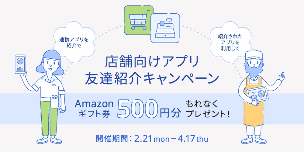 freee株式会社(本社:東京都品川区、CEO:佐々木大輔、以下「freee」)は「POSアプリご紹介キャンペーン」を2月21日〜4月17日の期間で実施します。freeeを利用いただいている方に対象の人気連携アプリをご紹介いただき、その方にキャンペーン期間中に利用を開始いただくと、紹介した方・紹介された方にもれなくAmazonギフト券500円分をプレゼントします。