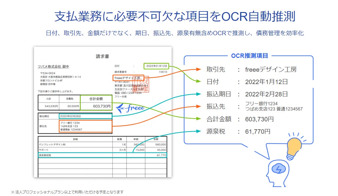そのため、入力作業を省くAI OCRは選択肢の一つとしてその重要性が増しており、freeeは、このたび電子帳簿保存法の検索要件をクリアした、機能強化したOCRを上位プランで提供することといたしました。