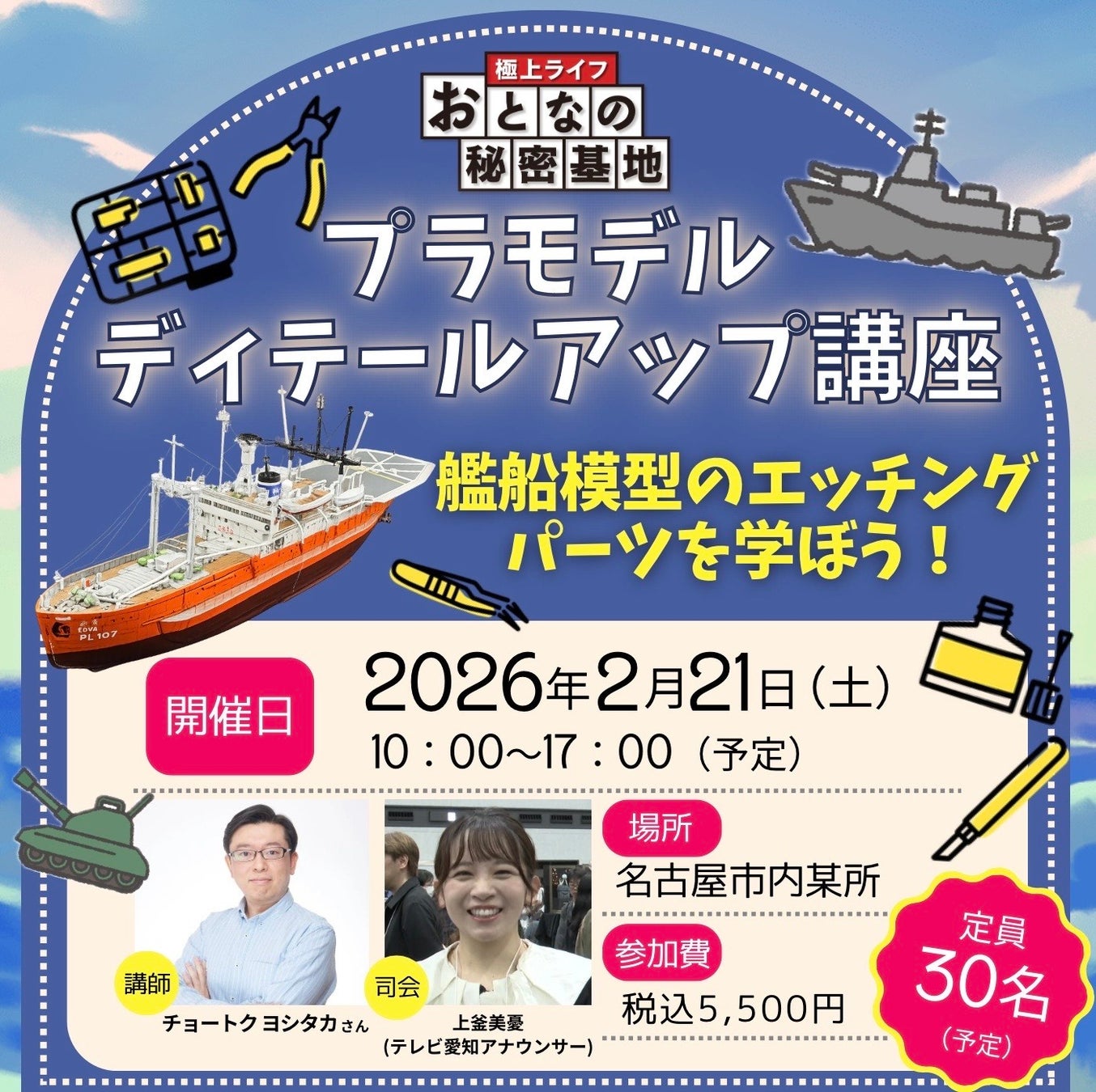 今回のテーマは「艦船模型のエッチングパーツ」。 扱いが難しい印象のあるエッチングパーツを、プロの技を直接見ながら学ぶことが出来ます!講師はプロモデラーのチョートク ヨシタカさん。司会・進行はテレビ愛知アナウンサーの上釜美憂が務めます。