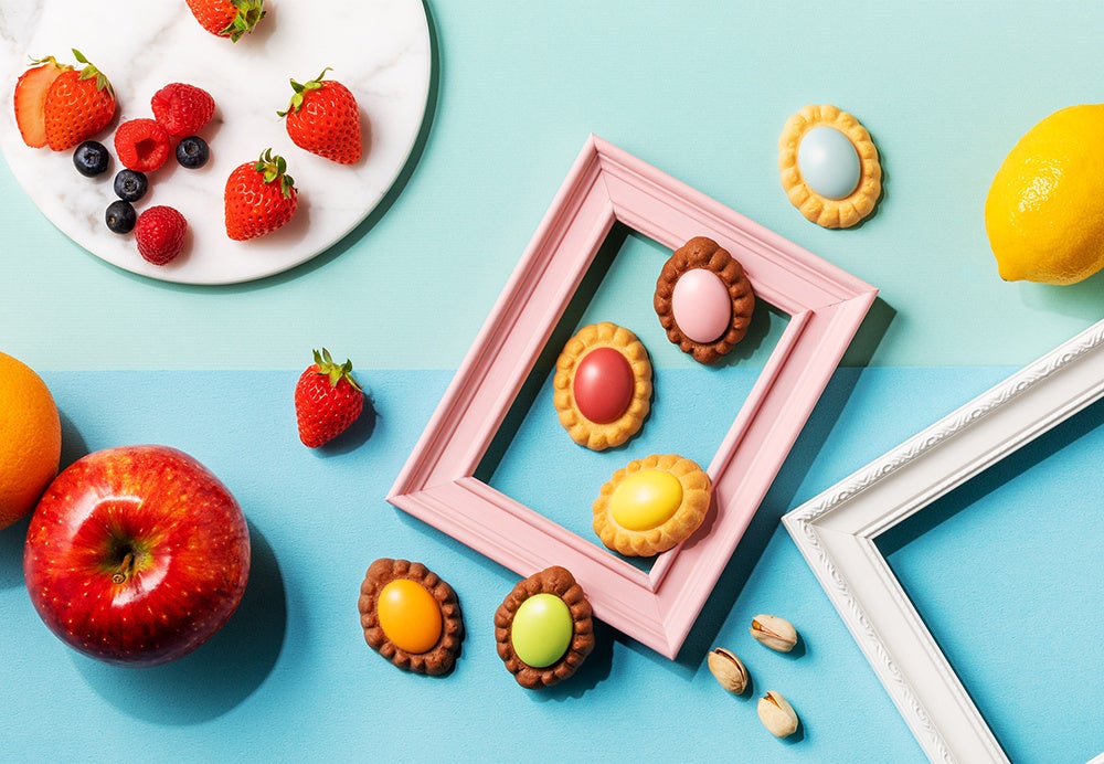 ブランド代表作。果実やナッツのコンフィチュールをとろっととじこめた 贅沢なコクの宝石ショコラを、カリッと香ばしいクッキーに重ねました。
