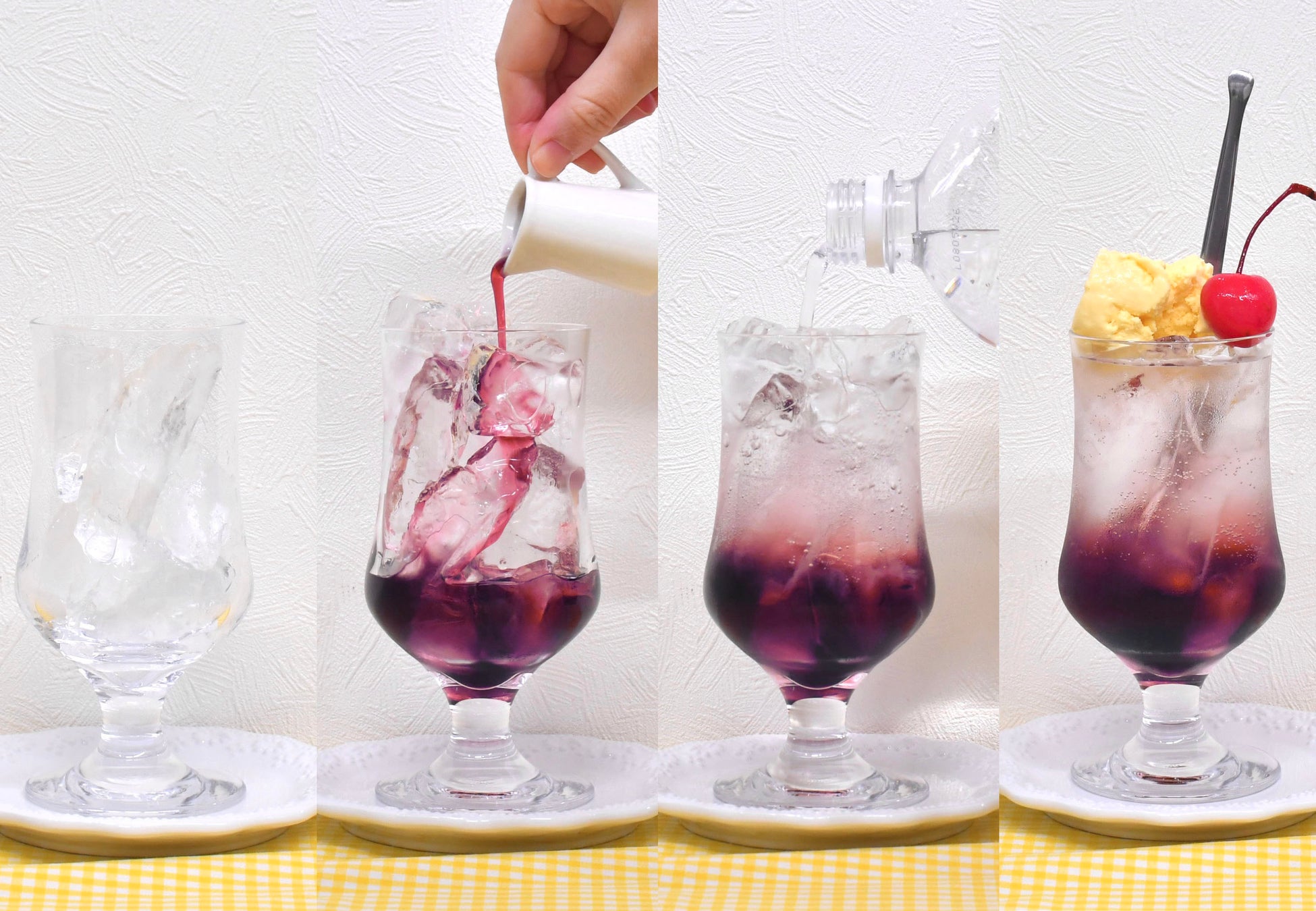 平成レトロな見た目が可愛すぎるクリームソーダ。お店や喫茶店では定番のメニューですが、実はお家でも簡単に作れること、ご存じですか?必要な材料は、かき氷シロップ、炭酸水、バニラアイス、お好みでさくらんぼなど。仕上げにベリールビーカットを乗せれば、可愛すぎる宝石クリームソーダの出来上がりです。