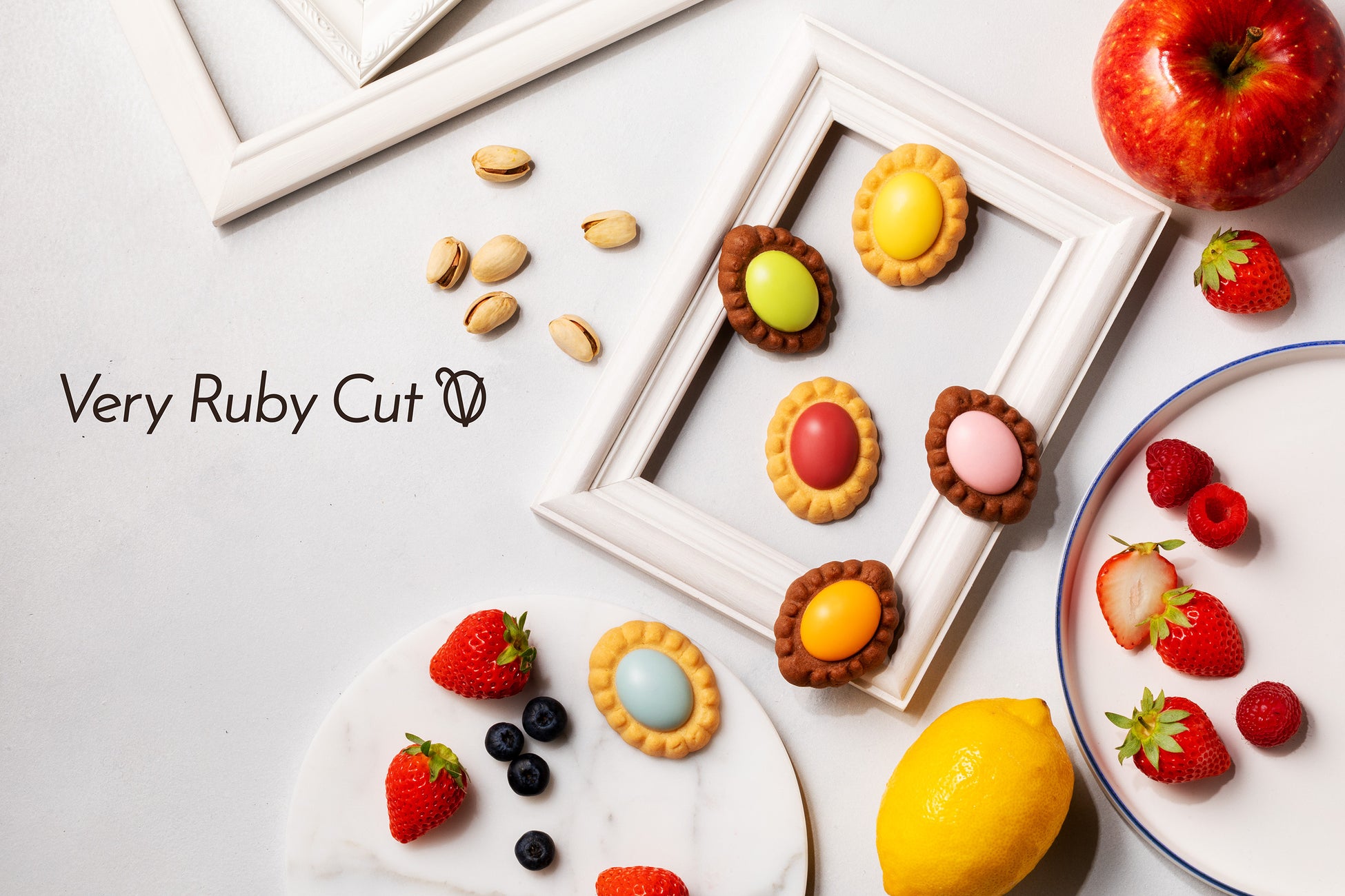 「Very Ruby Cut(ベリールビーカット)」がお菓子にこめたメッセージは 「Stay “Ruby Color” Show your True Color いつだってあなたらしく ルビーみたいに輝きつづけて!」。果実や木の実のおいしさをとじこめたルビー色の宝石スイーツ達の世界を、たっぷり楽しんでいただきます。