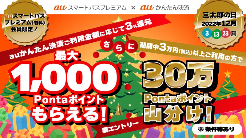 12月はご利用金額に応じてPontaポイント3%(3日間の合計で最大1,000Pontaポイント)還元に加えて、三太郎の日に税込3万円以上ご利用の方で30万Pontaポイント山分けの特典を追加します!三太郎の日は、毎月3・13・23日に開催するおトクな3日間で、auスマートパスプレミアム会員は特におトクな特典が受けられます。本キャンペーンは、2022年12月3日の三太郎の日から対象です。auかんたん決済は、Amazon.co.jpやDMM.comでのショッピングをはじめ、コミックシーモア、めちゃコミックでの電子書籍のご購入など、多くのお店でご利用頂ける便利なオンライン決済サービスです。