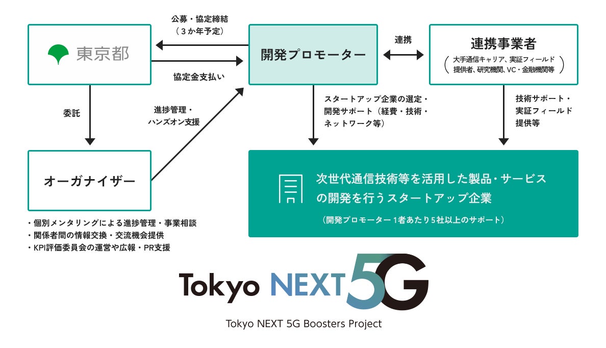 本事業は、東京都と協働して支援を行う事業者を開発プロモーターとして募集・選定し、スタートアップ企業に対し多角的な支援を行います。開発プロモーターは、3ヶ年度にわたり支援先スタートアップ企業等の開発・事業化を促進するため、連携事業者(通信事業者や実証フィールド提供者、研究機関、VC・金融機関等)と連携しながら、資金的、技術的な支援やマッチング支援等を行います。支援先スタートアップ企業は、開発プロモーター等の支援を受けながら、次世代通信技術等を活用した製品・サービスの開発及び事業上市を目指します。