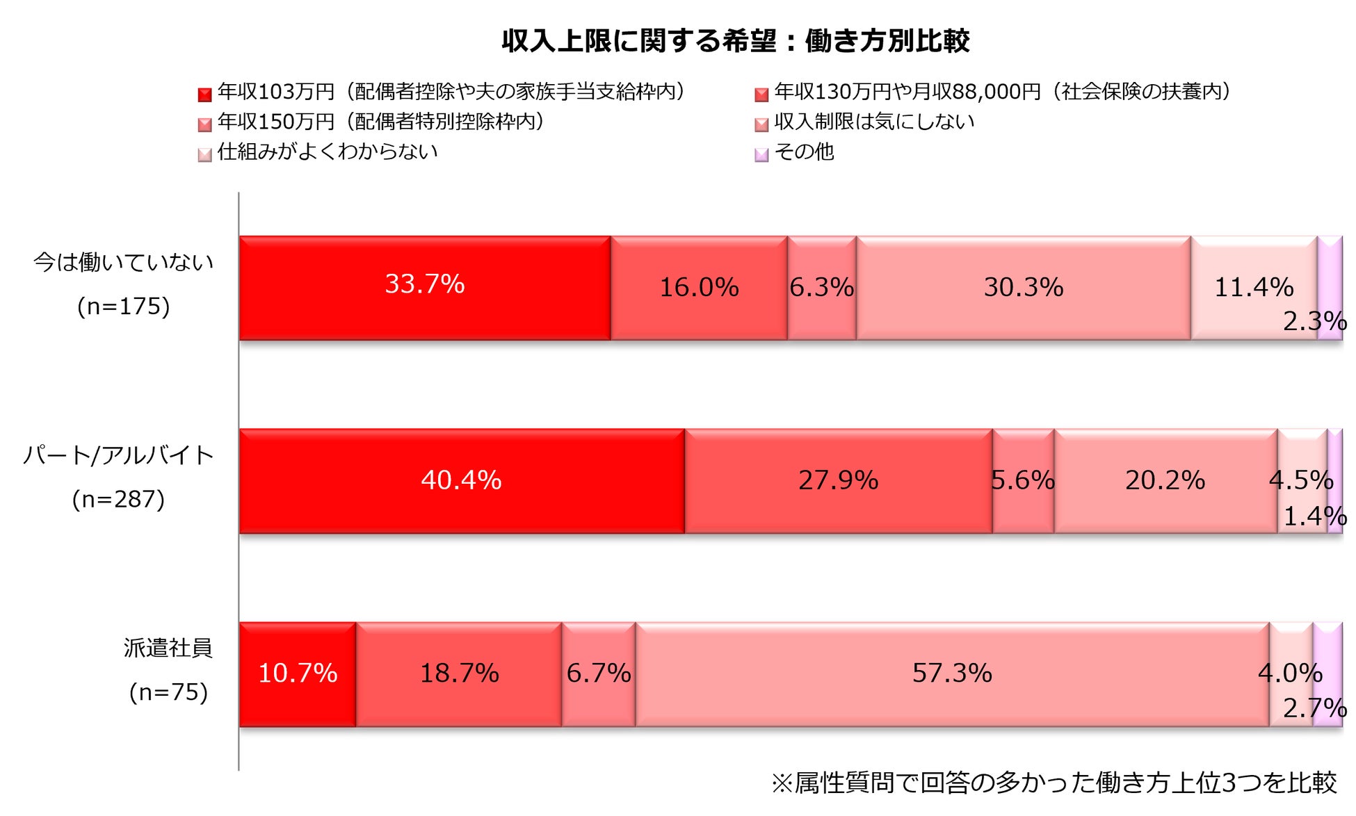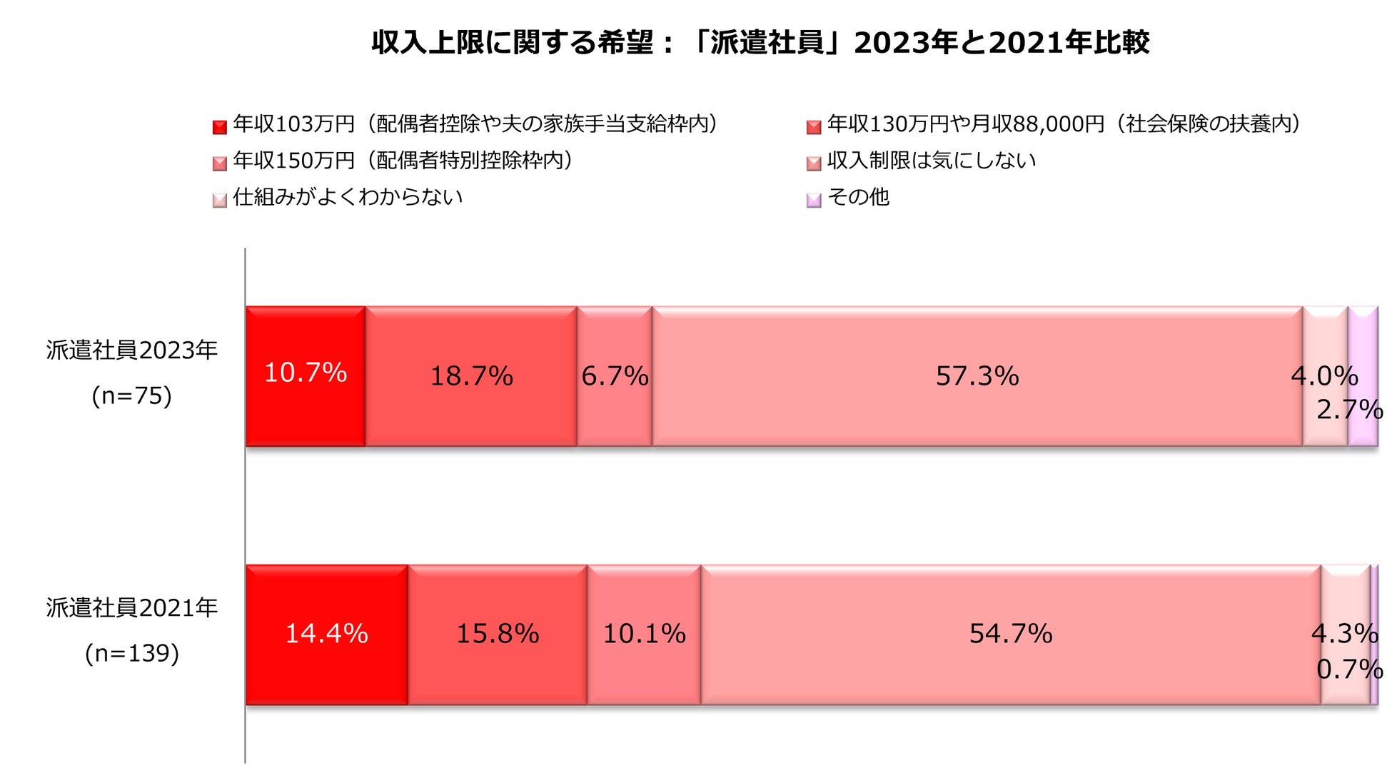 年収130万円など、扶養枠の年収上限の見直しが議論されています。仕事と家庭の両立を希望する主婦・主夫層に、「現在のあなたの収入上限に関する希望をお教えください」と尋ねたところ、「収入制限は気にしない」と回答した人が最も多かったものの、103万や130万など扶養枠の上限に抑えることを希望している人の合計は過半数となりました。また、現在の働き方に関する属性質問で回答の多かった上位3つを比較したところ「収入制限は気にしない」と回答した人の比率は「パート/アルバイト」が20.2%だったのに対し「派遣社員」は57.3%と大きな差がありました。時給が比較的高い(※1)派遣社員として働いている人は、収入制限を気にしない傾向が強いようです。さらに働き方別で2021年の調査(※2)と比較すると、 「パート/アルバイト」は「収入制限は気にしない」人の比率が7.6ポイント減少したのに対し、「派遣社員」は2.6ポイント増加しました。比較的時給が抑えられがちな「パート/アルバイト」は扶養枠内に収める方向にシフトし、比較的時給が高い「派遣社員」は扶養枠を外す方向へとシフトする二極化の傾向が見られます。