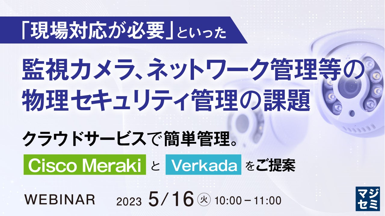 本セミナーでは、ネットワークや監視カメラなどの物理セキュリティの管理における課題と対策の方向性について解説すると共に、具体的な解決策としてクラウド型ネットワーク管理ソリューション”Cisco Meraki”と、クラウド型統合セキュリティソリューション”Verkada”についてご紹介致します。高千穂交易だからこそできる、両ソリューションを合わせた対策もご提案可能です。ネットワークや監視カメラなどの物理セキュリティにストレスを感じている方、管理をよりシンプルにしたい方は是非本セミナーにご参加ください。