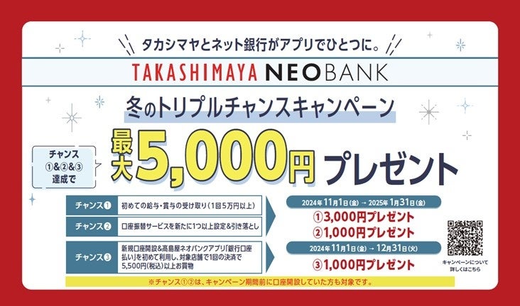 住信SBIネット銀行株式会社(本社:東京都港区、代表取締役社長(CEO):円山 法昭、以下「住信SBIネット銀行」)と株式会社高島屋(本社:大阪市中央区、代表取締役社長:村田 善郎、以下「高島屋」)は、より多くのお客様に高島屋ネオバンクをご利用いただくために「高島屋ネオバンク 冬のトリプルチャンスキャンペーン 最大5,000円プレゼント!」を2024年11月1(金)から実施します。
