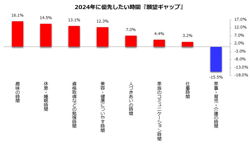 また、選択項目ごとに「2024年に優先したいと願う時間」の比率から「2023年に優先した時間」の比率を引いて算出した「2024年に優先したい時間『願望ギャップ』」がプラスなのは「趣味の時間」が最も大きく+16.1ポイント。それに対し、ギャップが最も小さかったのは「仕事時間」の+3.2ポイントで「趣味の時間」の1/5です。「趣味の時間」を増やしたい人は多く、「仕事時間」は概ね願望と近い状況にあるのかもしれません。一方、唯一マイナスだった「家事・育児・介護の時間」のギャップは大きくー15.5ポイント。「家事・育児・介護の時間」はもっと減らしたいと感じている様子が伺えます。疲れが溜まっているママたちにとって2024年が「休息・睡眠時間」を取りやすい一年となればと願います。そのための鍵を握っているのは、やはりママたちに負担が偏りがちな「家事・育児・介護の時間」のようです。