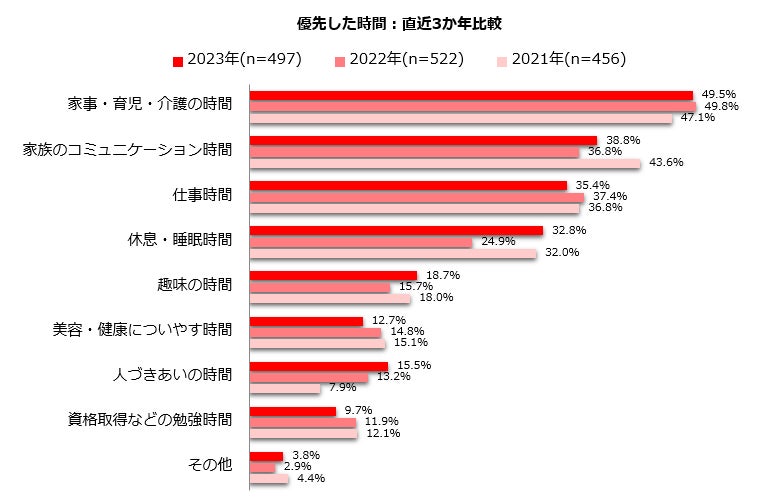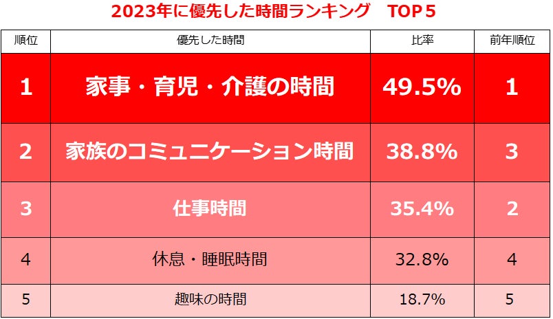 1.2023年に優先した時間 1位「家事・育児・介護の時間」49.5%