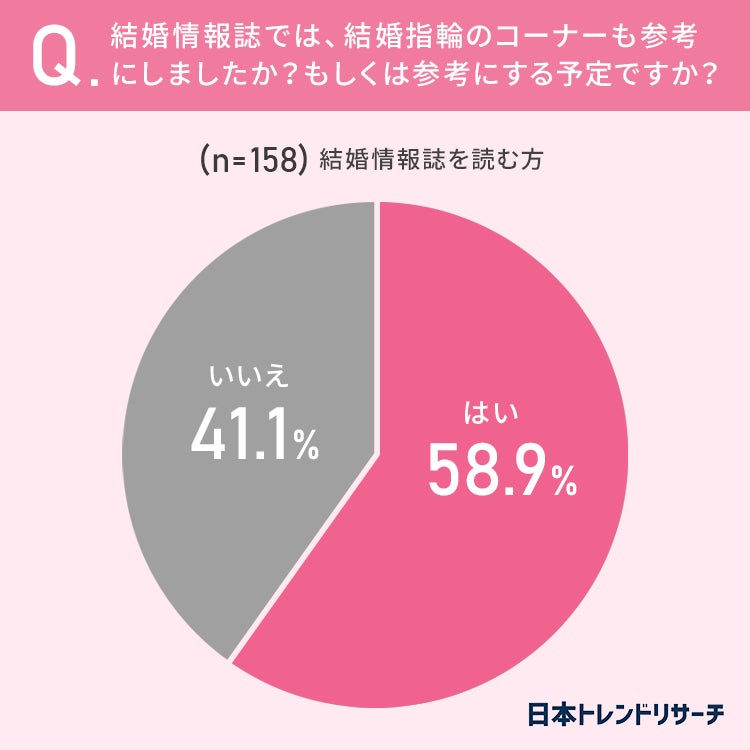 58.9%と半数以上の方が「結婚情報誌の中にある結婚指輪のコーナーも参考にした(もしくは参考にする予定)」と回答しています。