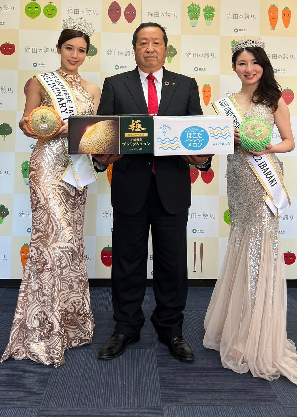 岸田市長は、ミスらに市の特産品で旬を迎えたメロンをプレゼントし「茨城から世界へ、世界一のメロンを食べて夢を追って下さい」と2人を激励した。