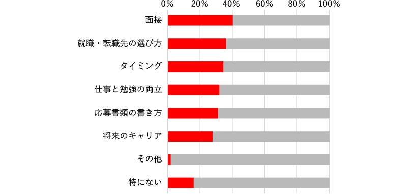 - 最も多かったのは「面接」(40%)、次いで「就職・転職先の選び方」(36%)、「タイミング」(34%)という結果になった。