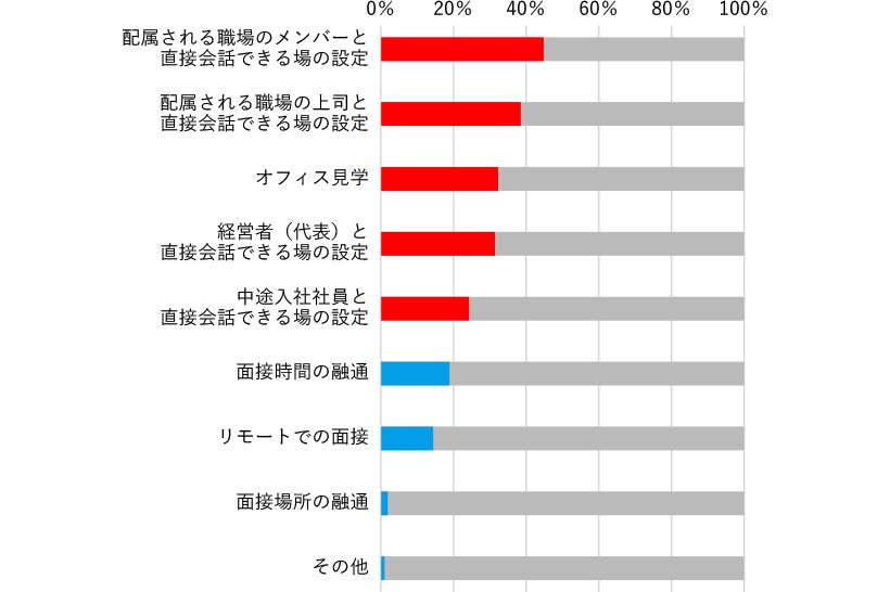 - また、2022年夏に実施した同様のアンケートの結果と比べ、「中途入社社員と直接会話できる場の設定」の割合が倍増した。夏時より在職中の参加者の割合が多かったことが要因ではないかと考えられる。