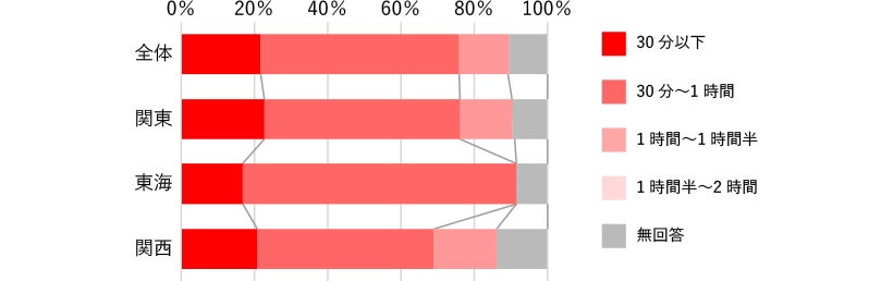 - 全地域で「30分~1時間」(54%)が最も多い。特に東海地方は他の地域と比べ、その層が2~3割多い結果となった。また関東地方と関西地方は、東海地方と比べ、希望の通勤時間に幅がある傾向がみられる。