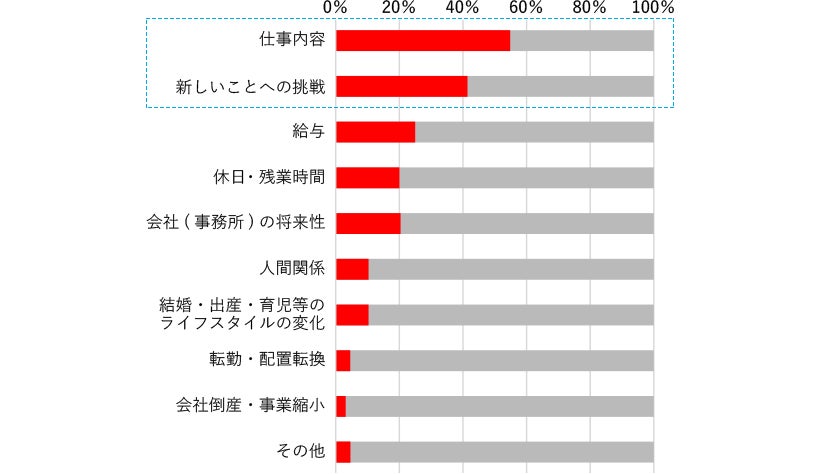 - 「仕事内容」(56%)、「新しいことへの挑戦」(41%)の割合が多いことから、将来のキャリアを考えたときに就職・転職を検討することがうかがえる。