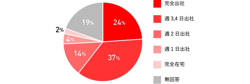 - 最も多かったのは「週3,4日出社」(37%)、次いで「完全出社」(24%)、「週2日出社」(14%)という結果となった。