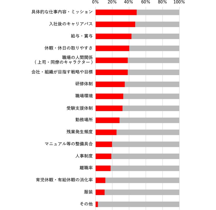 - 回答の多い上位3つは、【6. 就職・転職検討動機】の上位(「仕事内容」「新しいことへの挑戦」「給与」)が反映された結果となった。次いで、「休暇・休日の取りやすさ」(40%)、「職場の人間関係(上司・同僚のキャラクター)」(38%)と続いている点から、条件だけでなく職場の実状が分かる情報が求められている。