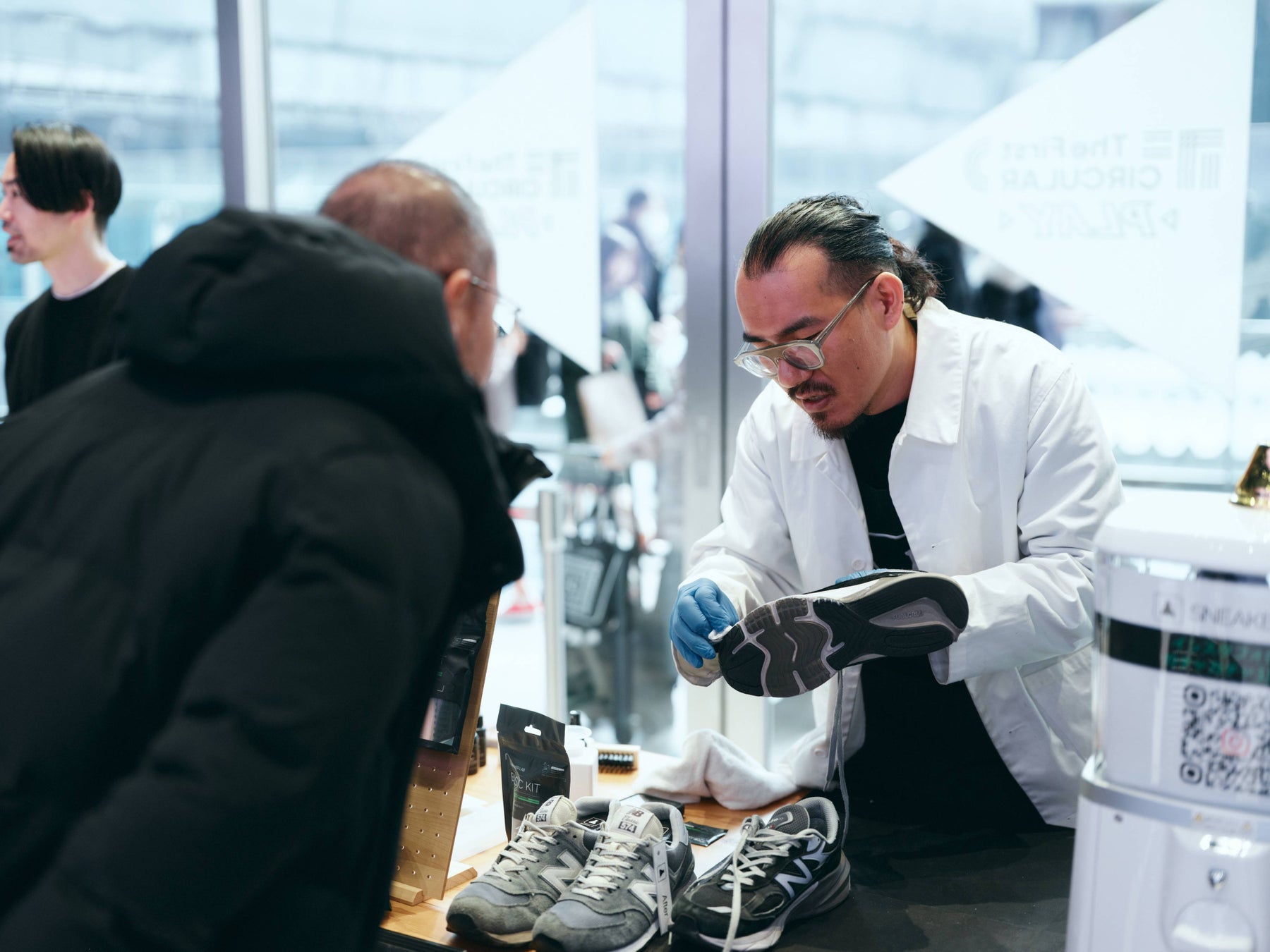 SNEAKER LABは「MAINTENACE BAR」にて、お気に入りのシューズを長く愛用していただくために、シューケアスペシャリストによる「無料スニーカークレンジング体験」を実施いたしました。SNEAKER LABの商品は、自然界のバクテリアや酵素を原料とし、化学成分を使用していないため、環境にも優しいのが特徴です。また、パッケージはリサイクル可能なサステイナブルデザインで環境に配慮しています。参加者には、普段愛用しているスニーカーのクレンジング体験を通して、「サーキュラーファッション」を身近に感じていただきました。