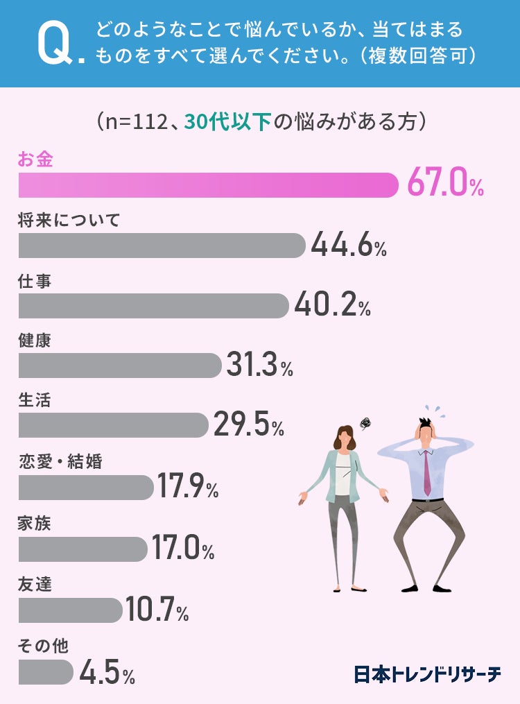 30代以下、40台はともに「お金」に関する悩みが1位となっています。
