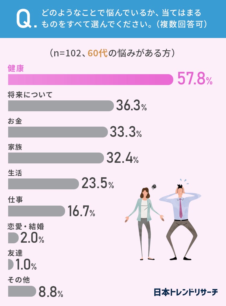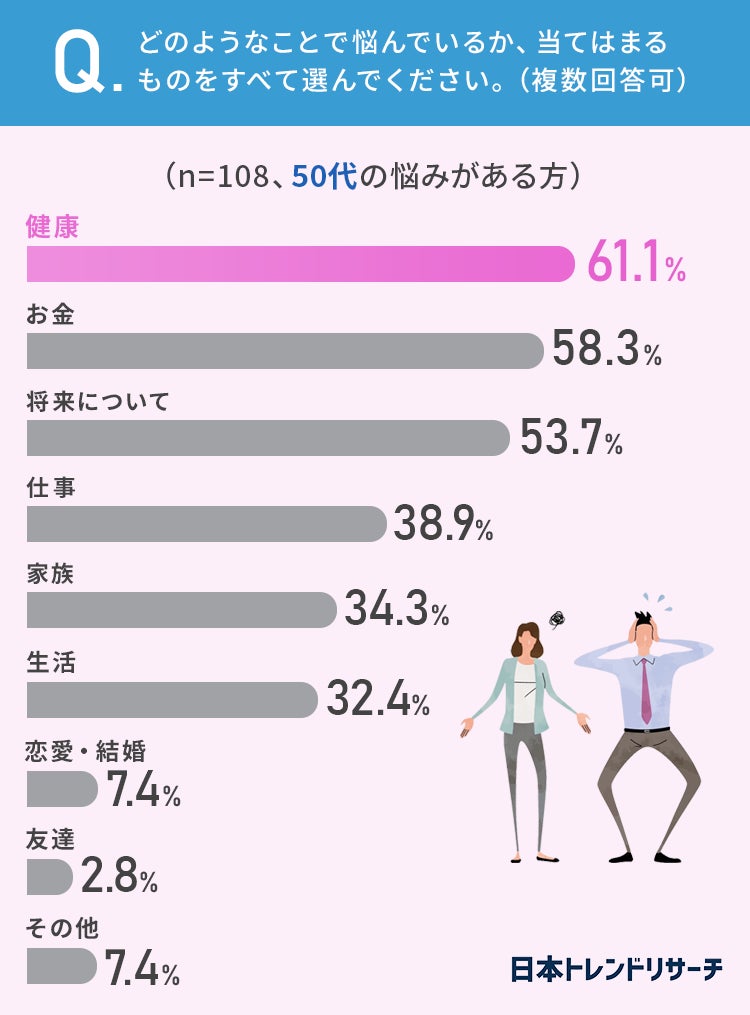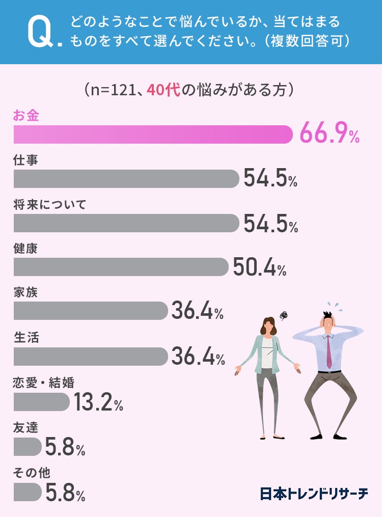 40代の男女のうち80.7%が「現在悩みがある」と回答しており、30代以下や40代は「お金」に関する悩み、50代や60代の方は「健康」について悩んでいる方がもっとも多いという結果になりました。