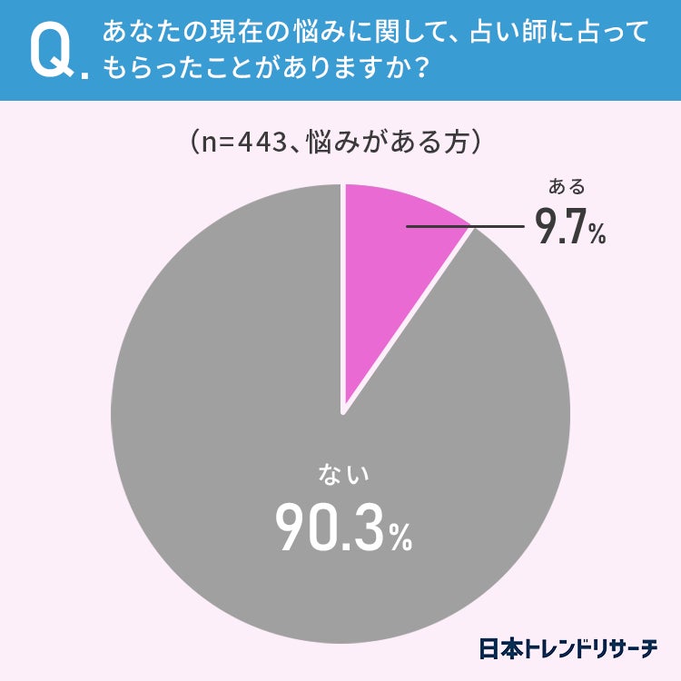 9.7%と、およそ1割の方が「現在の悩みに関して、占い師に占ってもらったことがある」と回答しています。