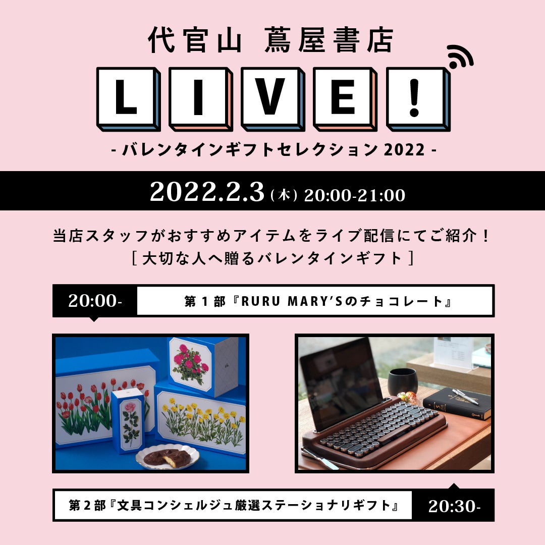 代官山 蔦屋書店(渋谷区猿楽町)は、2022年2⽉3⽇(木)20:00より、ライブ配信にて、文具やチョコレートスイーツといった大切な人へのバレンタインギフトにぴったりなアイテムをご紹介するオンラインイベント「バレンタインギフトセレクション2022」を開催いたします。