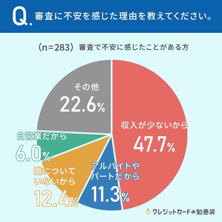 24.8%が「クレジットカードの審査で不安を感じたことがある」と回答しており、そのうち47.7%が「収入が少ないから」不安に感じたと回答しています。