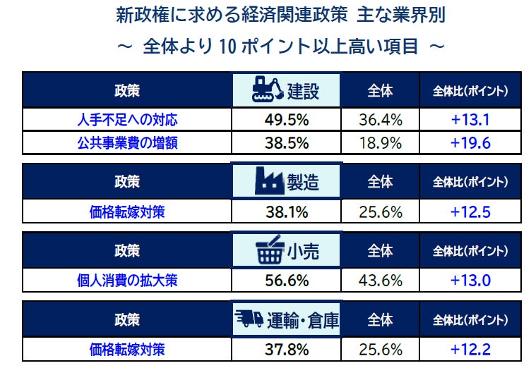 新政権に求める経済政策、「中小企業支援」が半数近くに 「物価高対策」ほか、「個人消費関連」も上位