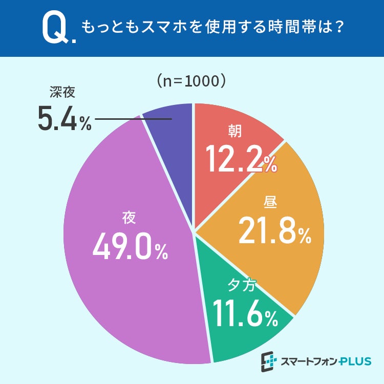 49%の方が「『夜』に最もスマホを使っている」と回答しており、その理由は「その日の情報が最も入ってくる時間帯だから」や「1日の終わりでゆっくりできる時間だから」といったものが挙げられていました。