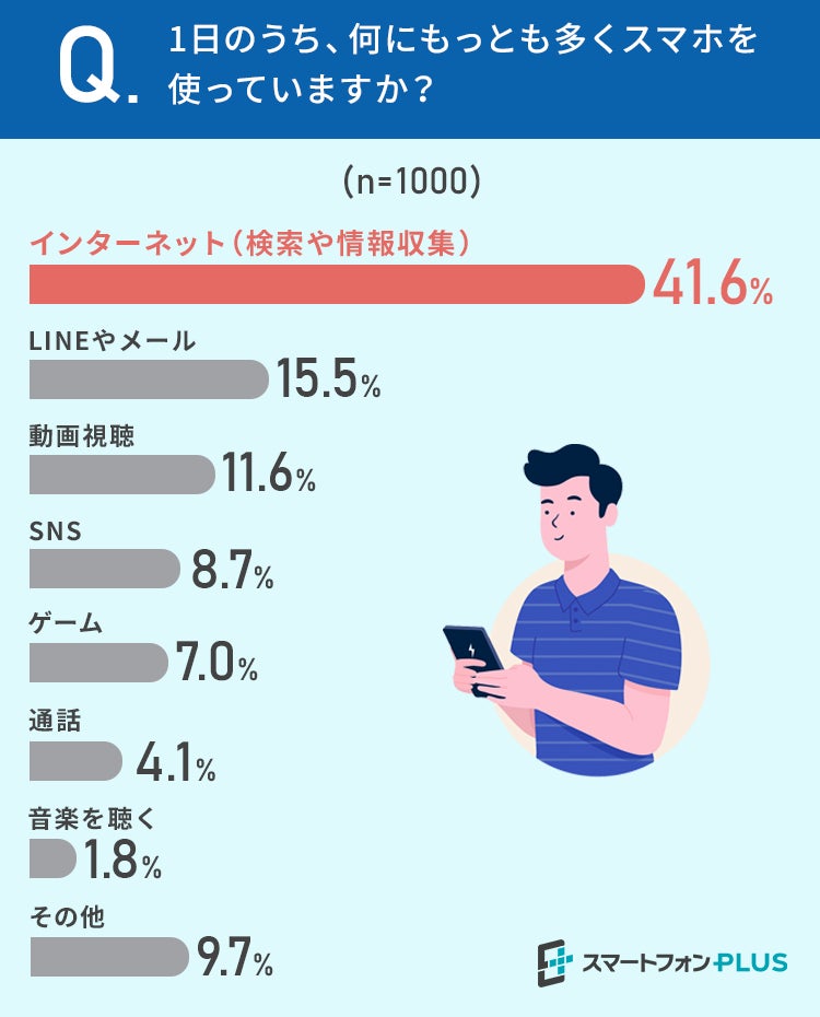 41.6%の方が「インターネット(検索や情報収集)」にもっともスマホを活用していると回答しました。