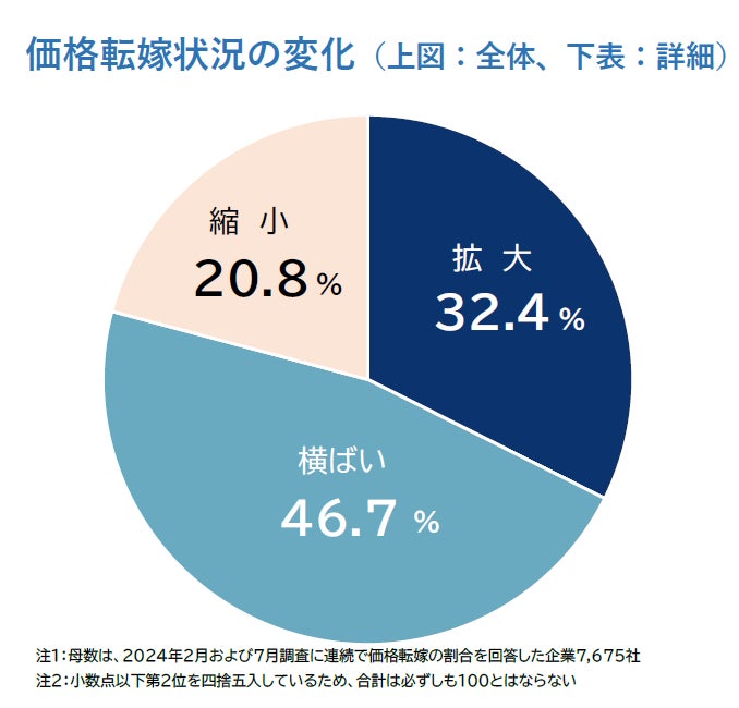 2月の価格転嫁状況と7月の同状況を比較すると、価格転嫁率が「拡大」した企業は32.4%にとどまり、「縮小」した企業は20.8%だった。また、変化がなかった「横ばい」企業は46.7%と半数近くを占めた。