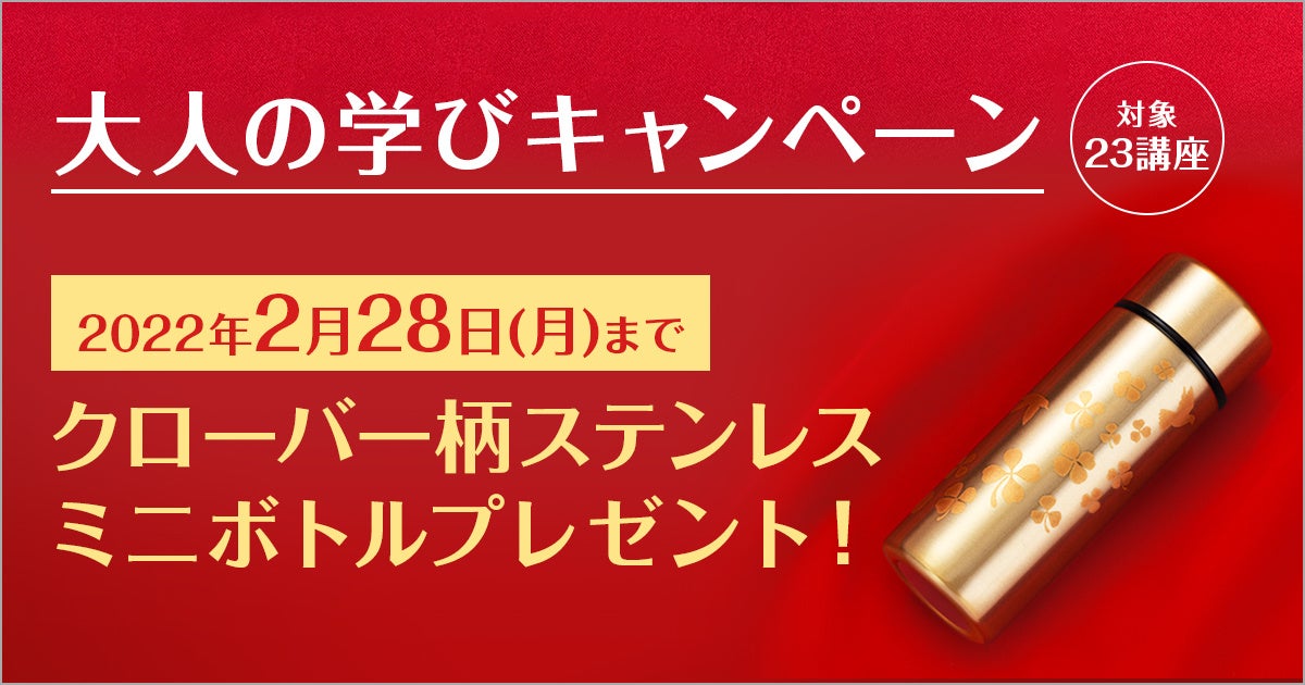 株式会社ユーキャンは、2021年12月28日より『大人の学びキャンペーン』を開始しました。今なら対象講座の受講申し込みをされた方全員に、もれなく素敵な「クローバー柄ステンレスミニボトル」を差し上げます。