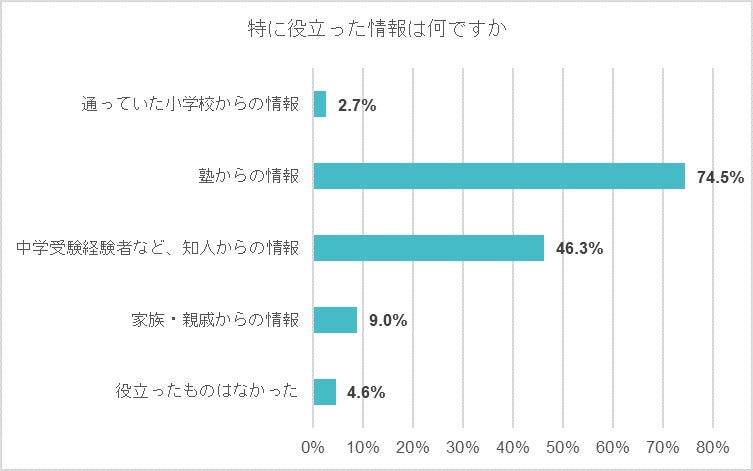 次に、【通っていた小学校や塾、知人からの情報収集】に関して、中学受験経験者の約9割が小学校や塾、知人から情報収集を行っており、メディアやウェブサイトからの情報収集と同じく、小学4年生の頃に情報収集を始めた人がもっとも多かった。特に役立った情報は、「塾からの情報」が74.5%、「中学受験経験者など、知人からの情報」が46.3%と多かった。小学校や塾、知人から情報収集を始めた時期については、68.2%が「適切だった」と回答した。